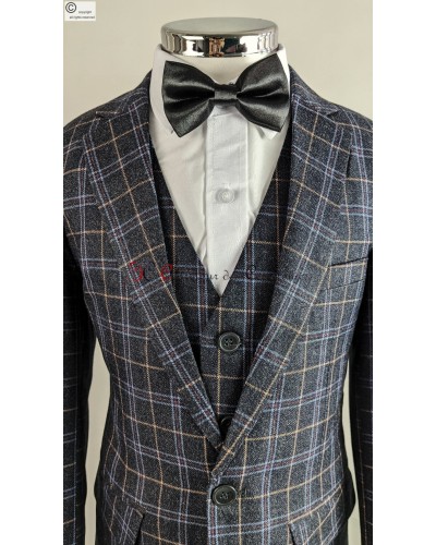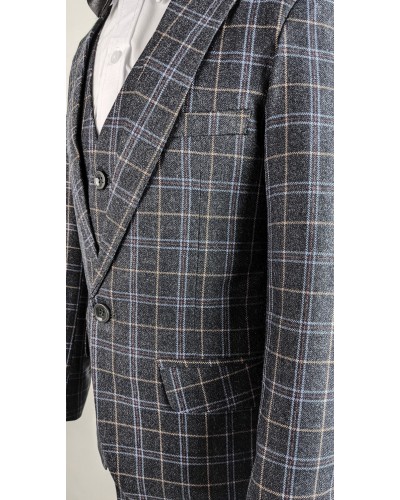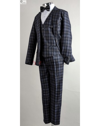 Costume de garçon, couleur gris foncé, aspect mat, grand carreaux a rayure bleu