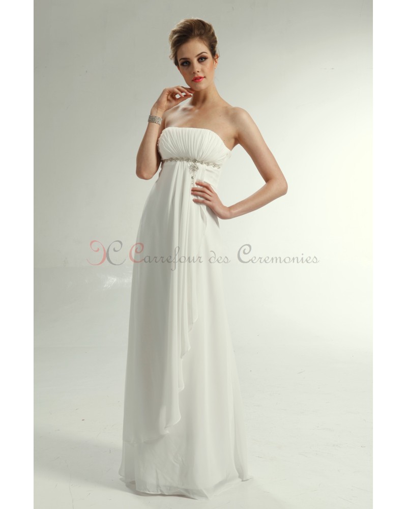 Ses points forts: la simplicité, l'élégance, la discrétion, le confort. Elle se porte aussi bien pour un cocktail, une soirée ou même en robe de mariée - bustier mis en valeur par un effet plissé, il est en plus marqué par une discrète chaine en strass sur le devant.