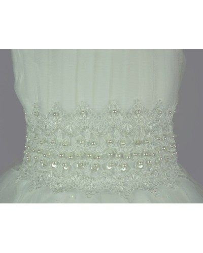 - taille marquée par une ceinture à nouer au dos, avec perles et motifs floraux sur le devant